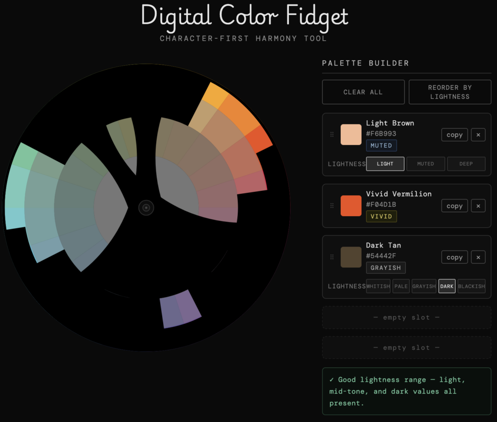 In 2024, I designed the Color Fidget. I created it in collaboration with The Gray Muse, who sold the Fidget as a pin and keychain in 2025. Well, we looked at the numbers (and the competition from Temu-style knockoffs!) and decided to discontinue the product. However, I thought the paradigm for choosing colors had merit. So I put together a digital version.