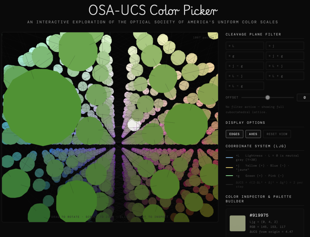 You know what else I love? The Optical Society of America’s Uniform Color Scales. An even more ambitious project that took even longer and ended up even more obscure! You can play with my visualization of that, too, and even use it to build palettes: